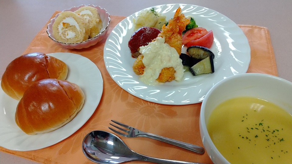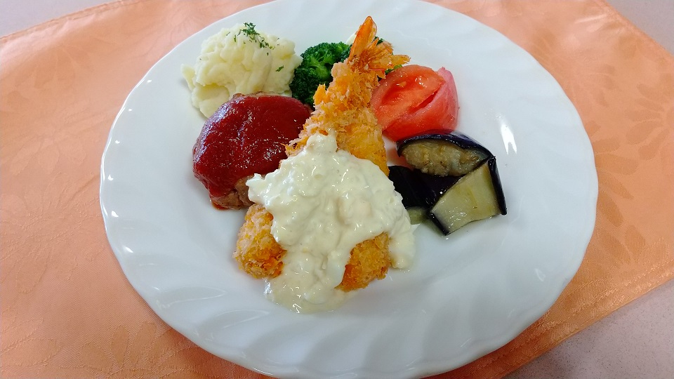 中央には主役として「エビフライ」と「ハンバーグ」。マッシュポテトに付け合わせの野菜類。見た目の彩りにも厨房スタッフを気配りを感じる主菜となっておりました。