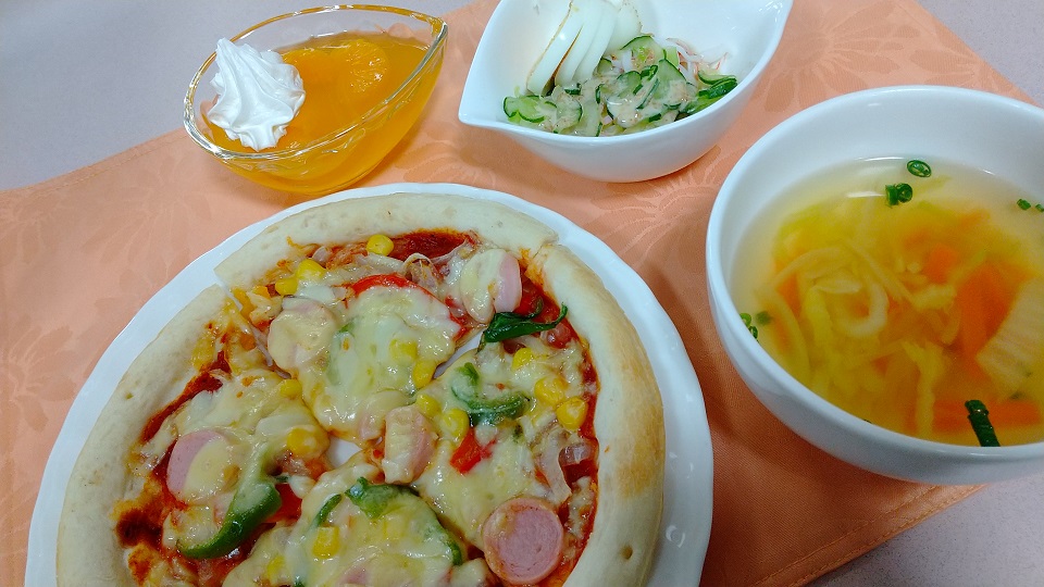 入居者様それぞれご自分で盛り付けられたピザと、スープにサラダとデザートのゼリーが本日のメニューで御座いました。