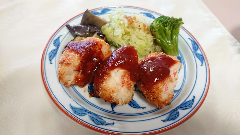 本物の「カニ」を使うのはコスト面、甲殻類アレルギー等といったリスク面など様々な懸念が有る為、カニカマを使用して、本格的なカニクリームコロッケの味わいを再現した当施設自慢の一品で御座います。