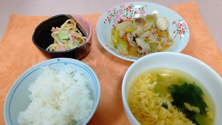 「八宝菜を食べて、卵スープやスパゲティサラダで味替えを変えて、また八宝菜を頂くと全ての料理を楽しめる」と入居者様よりアドバイスを頂けましたので、わたくしもそれに習いました。