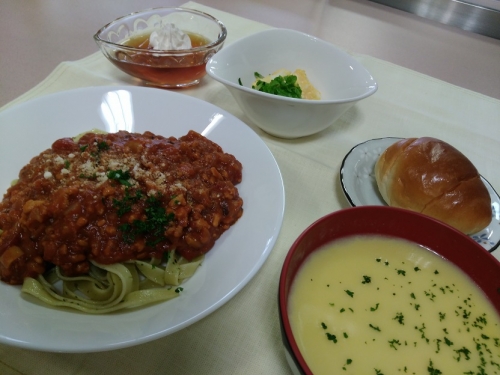 この日の献立は、お味や統一感など素晴らしい昼食でした。ちなみに、パスタは施設で作った自家製でした!