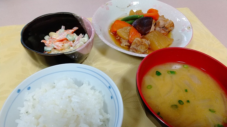 本日は、鶏肉と大根の煮物を中心としたお昼ごはんのご紹介です。