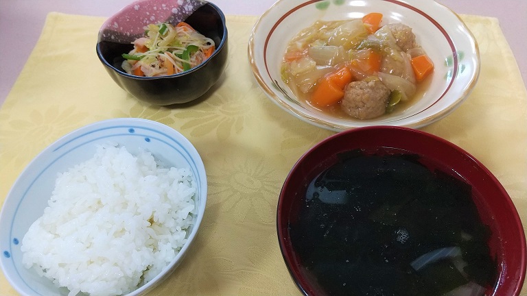 主菜が「肉団子の甘酢あんかけ」、副菜が「ビーフン炒め」、スープが「ワカメスープ」、これに白飯です。