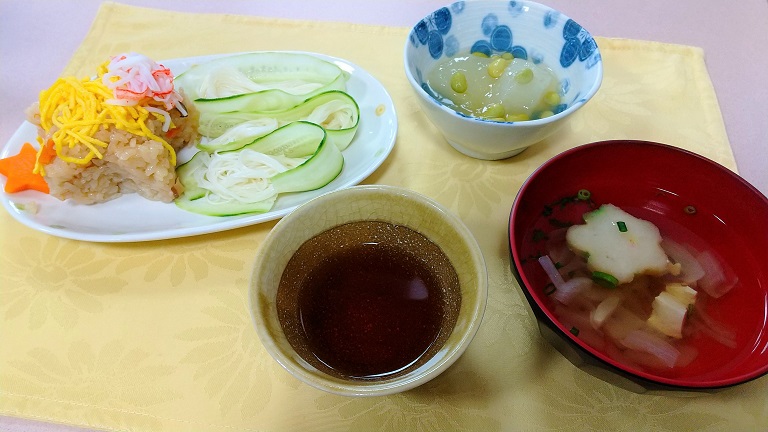 献立の中身は、星の型を使った「ちらし寿司」を始め、きゅうりの極薄スライスに巻かれた「そうめん」、この季節の風物詩の冬瓜を使った「冬瓜の煮物」、花麩を星に見立てた「お吸い物」となっておりました。