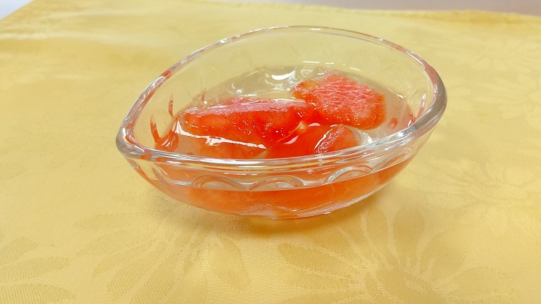 この日のスイカを生かしたメニューで、丁寧にスイカの種が取られたスイカの果実がゴロゴロと鎮座して、周りを涼し気なゼリーで寄せてありました。