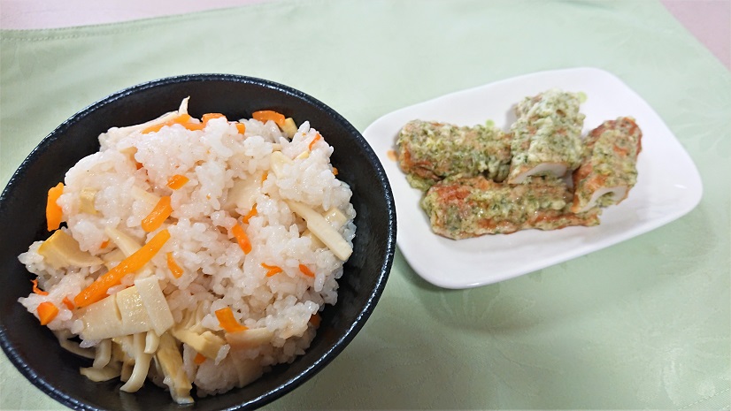 この日の献立は「筍ごはん」「豚しゃぶ」「竹輪の磯部揚げ」「お味噌汁」です。