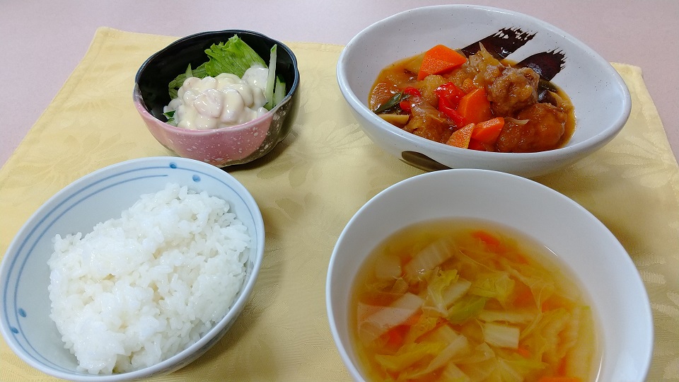 本日は中華御膳の日でございましたので、メインのお料理として「酢豚」、スープとして「白菜の(中華風)スープが一緒に並びました。
