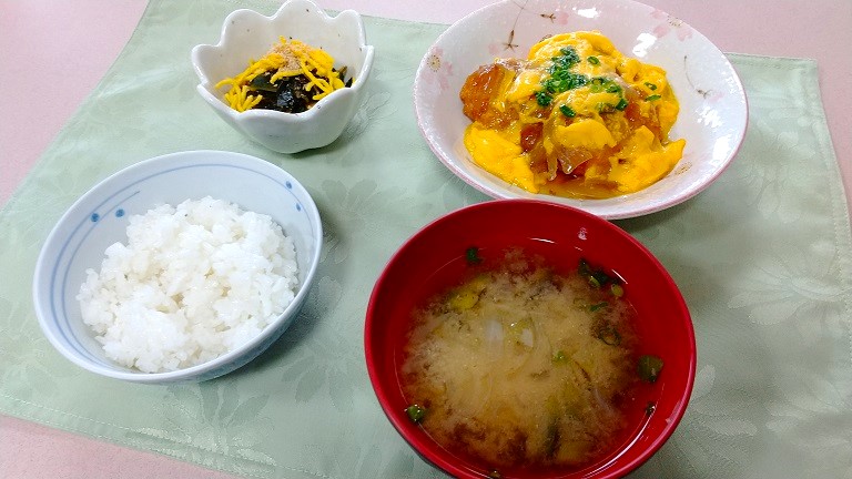 適度な噛み応えが残ったチキンカツが人気の秘訣で、ご飯が進む味付けも手助けしてくれたのか、本日も入居者様の完食率が高い日になりました。