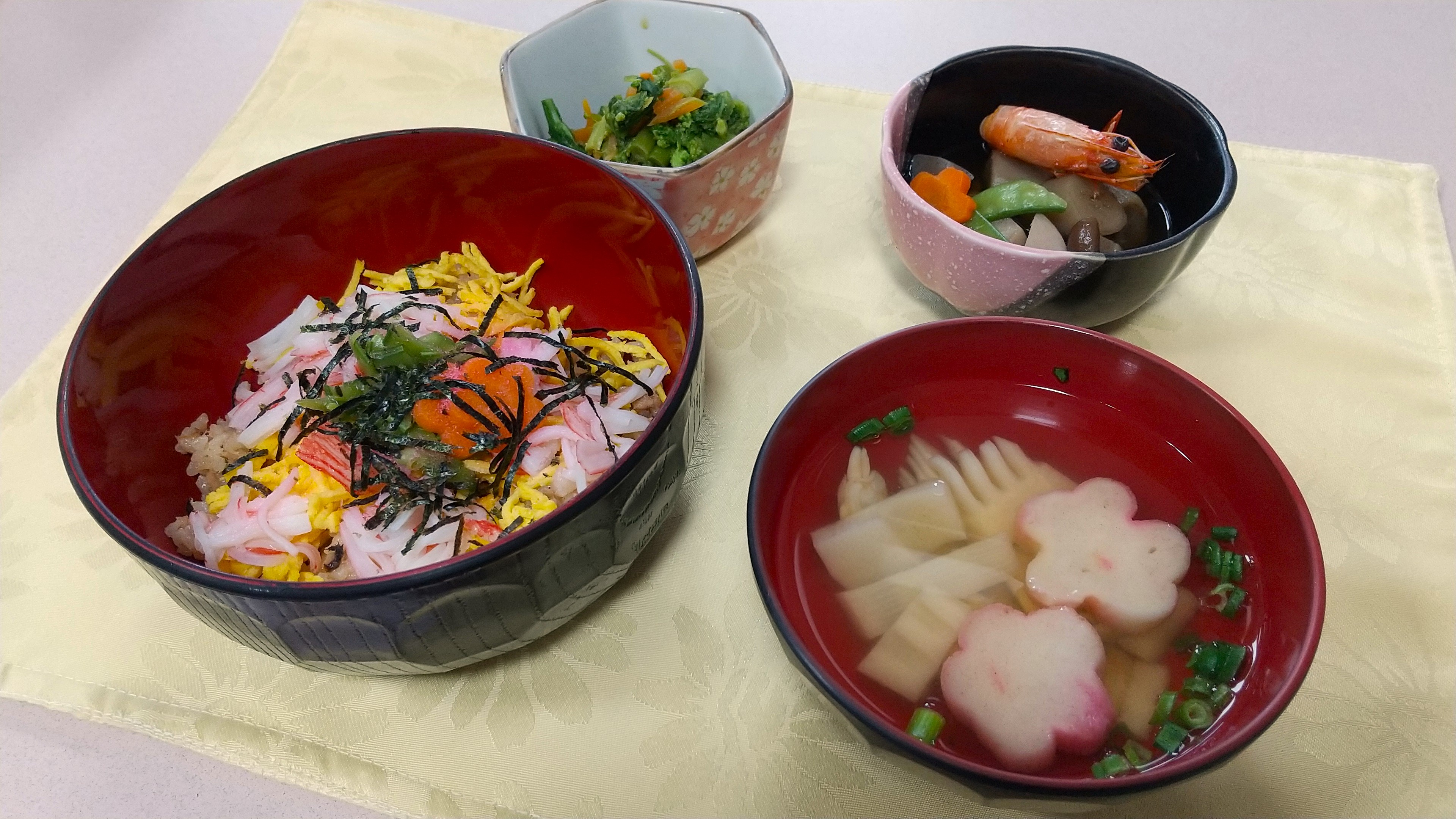 ちらし寿司と菜の花の辛子和えを中心とした献立です。