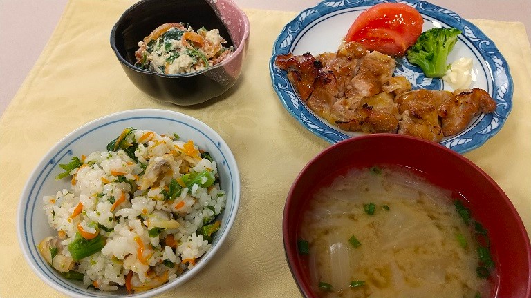 他の献立といたしましては、主菜が鶏の照焼き。小鉢が白和え。そしてお味噌汁です。