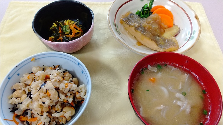本日の献立は「ひじき御飯」「豚汁」「カレイの揚げ煮」「酢の物」でした。
