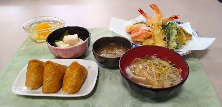 献立は「稲荷寿司」「天ぷら盛り合わせ」「高野豆腐の煮物」「そうめん汁」「フルーツゼリー」と日頃よりもボリュームも品数も豪勢でした。