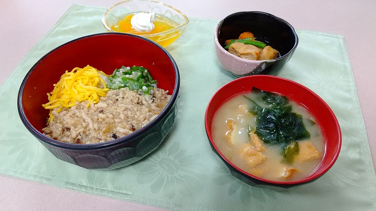 入居者様の人気が高い「三色丼」に、がんもどきの煮物、厚揚げのお味噌汁に、暑さにはありがたい「オレンジのゼリー」、以上が本日の献立でした。