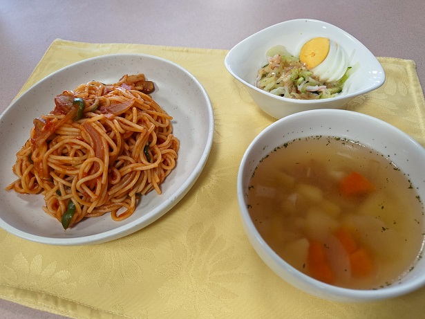 「スパゲッティナポリタン」に、盛り合わせサラダとポトフ風スープが献立でした。