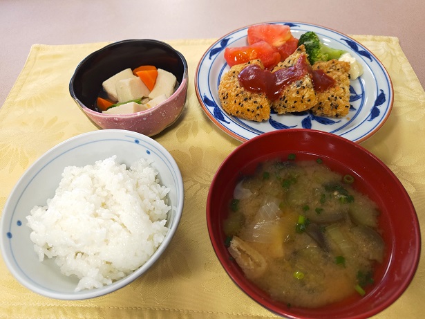 コロッケに高野豆腐の煮物とお味噌汁が相性がよく、気が付けば完食してしまう、そんな昼食でした。