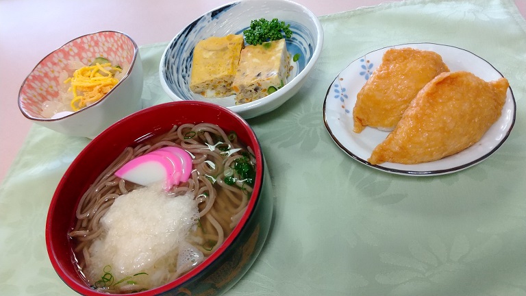 稲荷寿司とお蕎麦がお昼ご飯に出ました。蕎麦定食を外食で食べるような雰囲気を味わえる昼食でした。お蕎麦にのっているのは山芋と蒲鉾です。ふるさと舞松原では出汁にも拘っておりまして、和食の良し悪しに直結する出汁の具合は非常に厳しく調理しております。