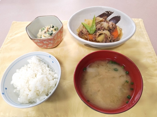 本日の献立は「肉じゃが」がメインのお料理。小鉢が「白和え」になります。そして白飯と具だくさん(撮影時は底に沈んでしまいました)のお味噌汁。以上になります。