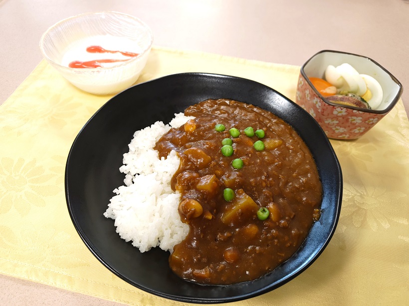 主菜は、やさしい味わいのキーマカレー。白いごはんの上に、ほぐれたひき肉と野菜の旨みが詰まったルーがたっぷりとかかり、緑のグリンピースがアクセントに彩られておりました。香りは食欲をそそりますが、辛さは控えめで、ご高齢の皆様にも安心して召し上がっていただける優しい仕上がりです。