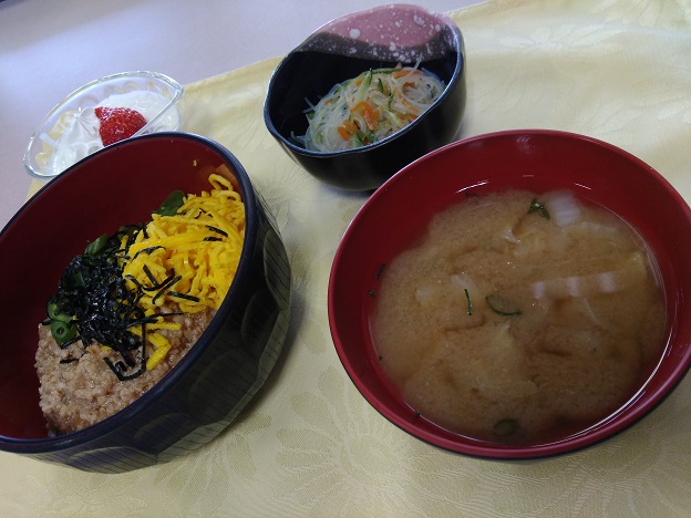 写真の丼物は、ふるさと舞松原の"三色丼"です。お肉・錦糸卵・さやいんげん・のり・紅しょうがと三色以上が彩られたりします。こちらのどんぶり、とても美味しくてトロミのあるお肉の部分を管理栄養士の方に作り方を聞いた所…