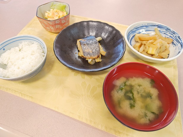 この日の献立は、メインの「鰆のキャベツ蒸し」を中心に、「大根の甘辛炒め」、「ポテトサラダ」、そして温かいお味噌汁が並びました。つやつやのご飯と共に、バランスの取れた和定食です。