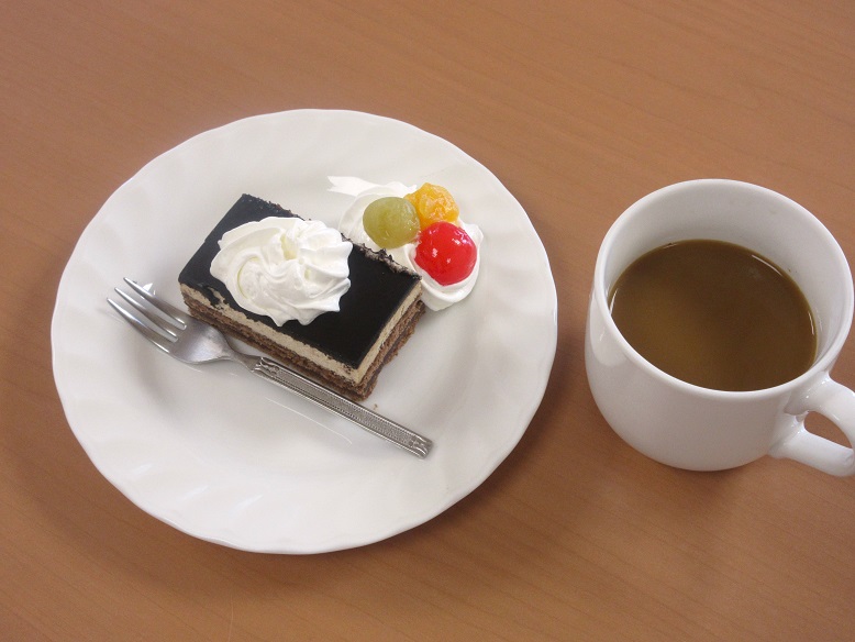ふるさと舞松原では、毎月1回、その月に誕生日を迎えられる入居者様のお祝いとして「誕生日会」を開催しております。今月の誕生日会では、チョコレートケーキと温かいコーヒーをご用意いたしました。