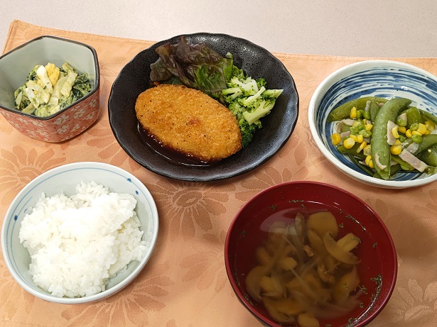 献立は「すき焼き風コロッケ」「スナップエンドウとコーンのソテー」「菜の花の玉子サラダ」「マッシュルームスープ」「白米」でした。