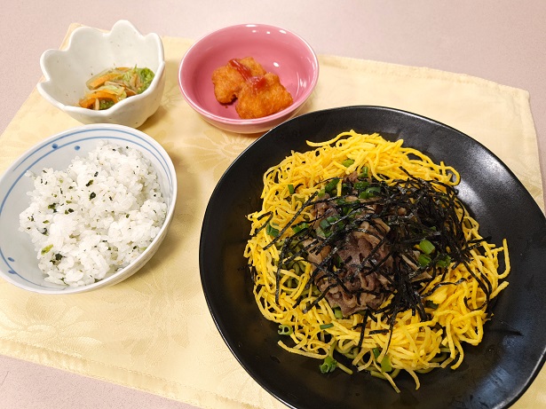 本日の昼食は、山口名物の「瓦そば風」がメインの、麺類の献立でございました。
