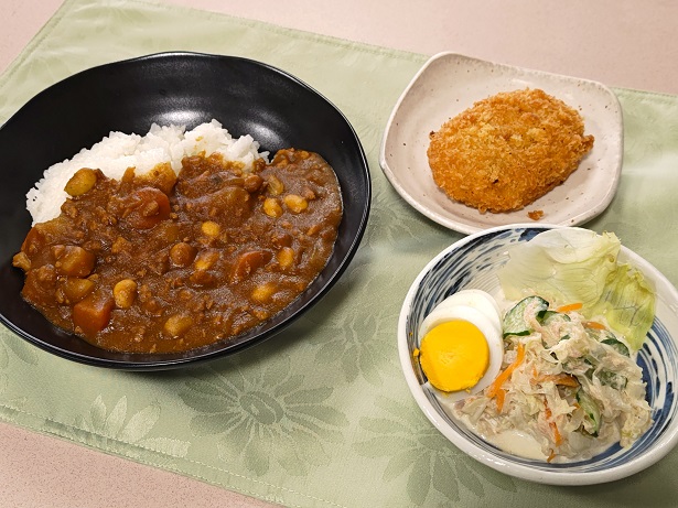 辛すぎない…しかし香辛料の美味しさは感じる。そんな絶妙な施設謹製の豆カレーです。こちらにトッピングにも使える別皿のコロッケが添えられて、栄養バランスに配慮したツナサラダで本日の献立で御座います。