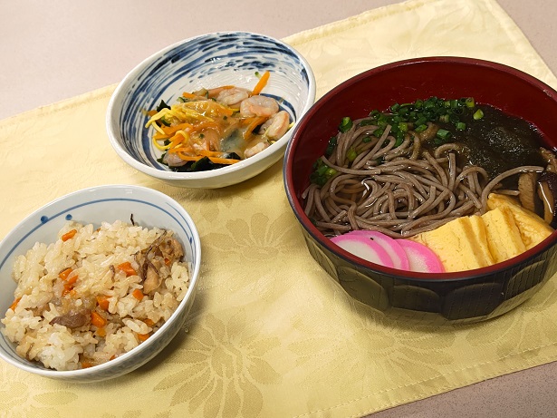 主食は、具材たっぷりの「五目そば」です。かまぼこ、玉子焼き、しいたけ、わかめ、ネギの五品目が色鮮やかに盛り付けられ、見た目も楽しい一品でした。温かいお蕎麦は、出汁をしっかりとることから調理しており、当施設の専任スタッフが心を込めて作ったオリジナルのお味です。
