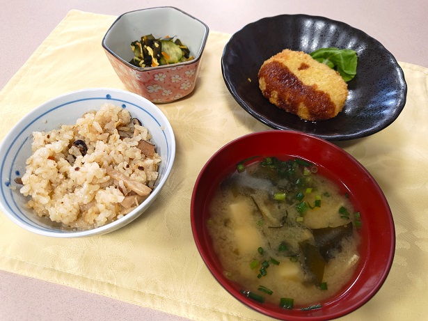 ほっこり温まる!「きのこご飯とコロッケ」の昼食