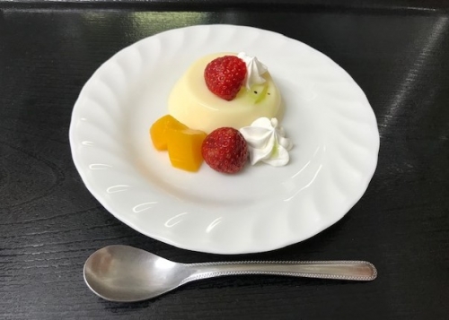 おやつの時間にプリンが出ました。今回はプリンにイチゴや生クリームが添えられていて見た目で楽しみ、味で楽しむ事が出来るデザートでした。梅雨も近づき、段々と日増しに暑くなって参りましたので、涼しいデザートにとても喜ばれておりました。