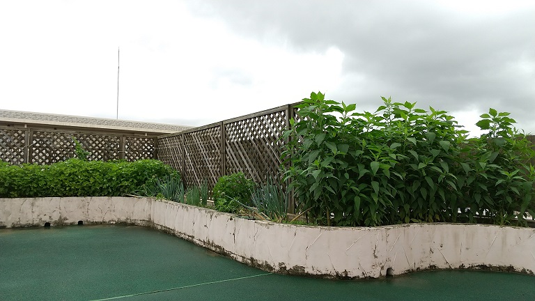 老人ホームふるさと舞松原の屋上には、屋上庭園と菜園が御座います。入居者様が散歩をされたり、入居者様や職員の気分転換の場所になっております。時には涼みにも使われております。