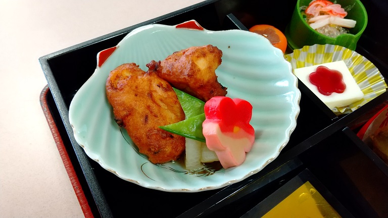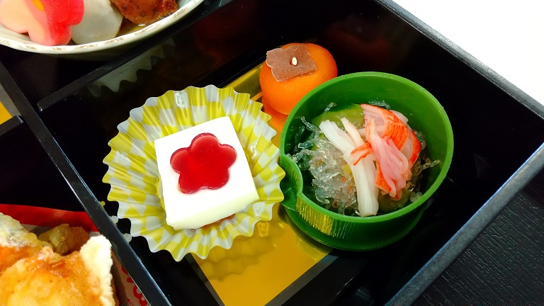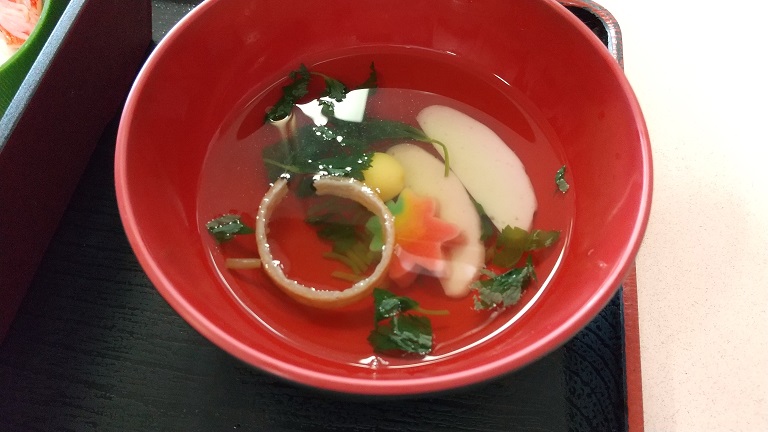 酢の物は、サラダ麺でしょうかコリコリとした無色透明な麺が入った一品で箸休めにもぴったりでした。そしてデザート。柿の形の練り切りと紅白寒天の2つも入っておりました。食事の最後にお茶と頂きました。