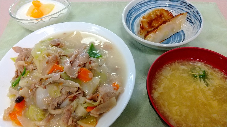 五目あんかけ焼きそばの様な中華料理屋さんで頂くようなメニューをまさか、老人ホームで頂けるとは思いませんでした。具材の種類もたくさん。お肉もたくさん。この日のあんかけ焼きそばとは微妙に違うお味でした。